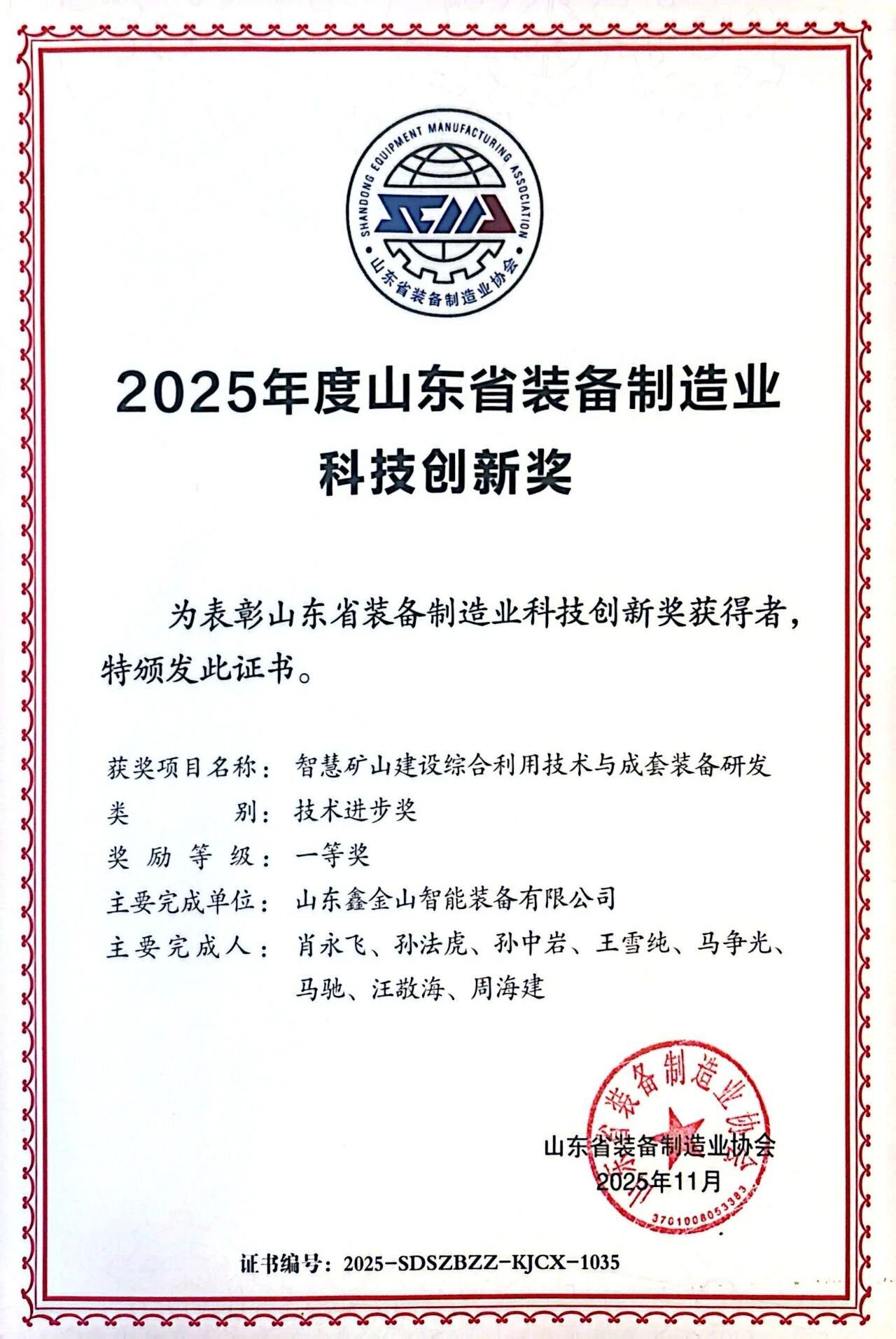 近日,山東省裝備制造業(yè)領(lǐng)域傳來(lái)重磅捷報(bào) —— 由山東鑫金山智能裝備有限公司自主研發(fā)的 “智慧礦山建設(shè)綜合利用技術(shù)與成套裝備研發(fā)” 項(xiàng)目,在 2025 年度山東省裝備制造業(yè)科技創(chuàng)新獎(jiǎng)評(píng)選中脫穎而出,榮膺一等獎(jiǎng)!這一省級(jí)權(quán)威榮譽(yù),是對(duì)鑫金山科技創(chuàng)新實(shí)力的高度認(rèn)可。